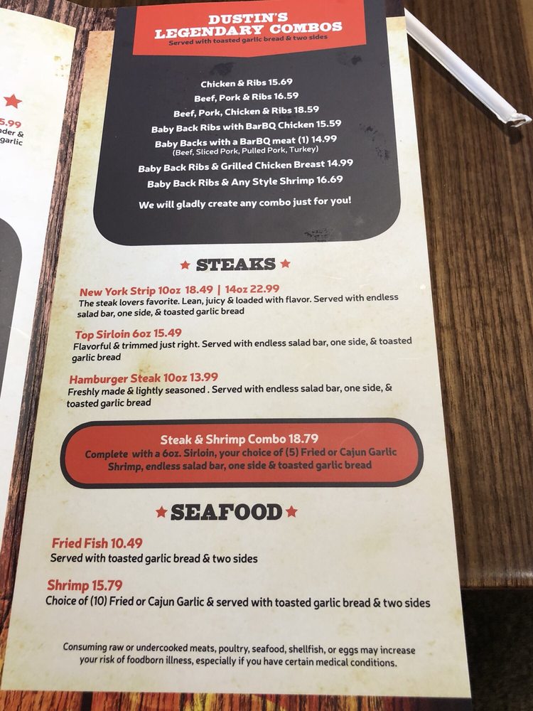 Additionally, the salad bar is a standout, brimming with fresh, vibrant choices that complement any meal. With excellent service from attentive staff like Malissa and Tawny, you'll feel right at home. Discover why locals rave about Dustin's—it’s not just a meal, it's a true BBQ experience!